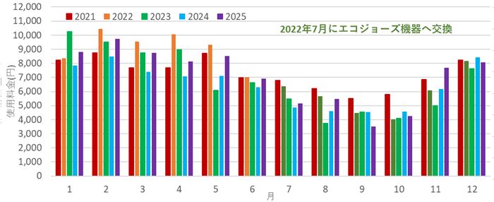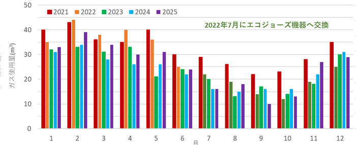 なお、リンナイ PS扉内収納ボックスUOP-P030(給湯器まわりの取り付け用枠:写真参照)を使えば、取付枠の大きさの差は吸収できたので、ノーリツからリンナイへの交換は他のガス、水道、給湯など配管類の取付寸法は同一であったので問題なく行うことができました。リンナイからノーリツへも、扉内ケースTC-4などを組み合わせれば、同様に行えるものと思われます。 以上の検討結果から、今回はリンナイのRUF-E2406AUを選び、リモコンはWi-Fi接続+スマホアプリで遠隔操作や使用状況をモニタリングできるリモコンセットMBC-302VCを組み合わせました。このあたりのエネルギーの見える化は、筆者のこだわり(職業病)なのかもしれません。MBC-302VCの取扱説明書を読んでいると、「選べるEcoモードを使う」という項目があり、この中には5種類の設定がえらべるようになっていました。これらの機能は、定格性能以上に高効率運転を実現するものではないかと期待されます。そこで、まず「省エネ湯はり」する、「エコおいだき」する、「自動たし湯オフ」すると設定しました。「省エネ湯はり」は、効率の良い状態で燃焼して省エネ湯はりを行うものです。その反面、湯はり時間が長くなる場合があるとのことですが、これは受け入れるしかないです。「エコおいだき」は、設定温度よりも低い温度で機器の燃焼を停止させ、ポンプ循環により機器に残った熱を効率よく使用するものです。これも通常のおいだきより時間がかかる場合があるようですが、良さそうな機能なので使うことにしました。「自動たし湯オフ」は湯量が減った場合に自動的にお湯を足す機能ですが、必用なときは自分で足せばよいと考えました。一方、「節約保温」は、お湯が貯まったあとに湯温を維持する機能があるのですが、その際の温度を低めに保つ機能です。保温するためにはガスを使うので、速やかにふろに入ればよいと考え、「保温時間」を0時間にして、「節約保温」しないと設定しました。(よくよく考えると、「保温時間」0時間とすれば、「節約保温」はどちらでも変わらないと思われます。) もっとも設定で悩んだのは「省エネ給湯」の項目でした。ガス給湯器には、点火直後にできるだけ早く設定温度のお湯を出すため(温度を安定させるためでもある)にQ制御(PRO-TECメカ)と呼ばれる仕組みがありますが、「省エネ給湯」設定は徐々に温度が上がればよいと割り切るものです。Q制御は少ない出湯を繰り返す場合にはありがたい機能ですが、その分はガスを多く消費します。序盤は冷たくても我慢できるのであれば「省エネ給湯」する、でよいのですが、筆者は我慢できずに温かいお湯が出るまで待ってしまうので、水とガスの消費量が増えてしまいそうです。ここだけはあえて「省エネ給湯」しない、の設定にしました。 ガス使用量の変化ガスふろ給湯器を交換する前後における月単位のガス使用量の変化を以下に示します。ガスふろ給湯器は2022年7月に交換しました。下記グラフは毎月8日前後の検診日の月となっっているため、実質的には3週間程度=1ヶ月近く遅れている(2月→ほぼ1月)と考えてください。