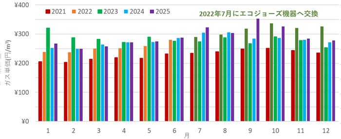 第7回 マンションでの省エネ型ガスふろ給湯器=エコジョーズへの交換事例 (2026年01月12日)CO2ガスの排出を抑えてガス代も節約したい2022年は世界情勢が不安定になり、LNGや原油の供給に影響が出ており、それらの価格が上昇しました。電気代も値上げが続き、困ったものです。我が家(マンション)のガス給湯器(ガスふろ給湯器)は2008年に設置されてから14年が経過していて、故障リスクがかなり高まってきました。同じマンション内でも給湯器が故障して交換したというような話しも聞こえてきているので、そろそろうちもかな?と考えるようになりました。しかも、世界的な半導体不足によりガス給湯器は、機種によっては発注してから数ヶ月待ちが当たり前の状況もあるようです。これは、そろそろなんとかしなくては・・・と焦ります。今回は、エアコンの検討を行った前回に引き続いて、ガス給湯器について検討しました。2022年に交換、以後2025年までガス消費量(レンジを含む)をモニターしています。 ガスふろ給湯器の選定給湯器には、ガス給湯器とエコキュート(ヒートポンプ式給湯器)があます。細かく見れば、石油給湯器、電気給湯器(電気ヒーター方式)、ハイブリッド給湯器(電気(ヒートポンプ)+ガス)などもあり、さらには、ふろ専用、暖房機能付き、台所専用なども存在します。エネルギー効率や災害時の水確保の観点からは、エコキュートやハイブリッドが付けられると良いと思います。しかしマンションのベランダは共用部となっていて、隣室からの避難経路にもなります。エコキュートのように大きな貯湯タンクをもつ設備は、大規模修繕工事の際にも動かしにくいためあとから設置することが難しいのです。さらに、室内側から200V電源、給水管、温水管などを通す必用があります。外壁に穴を空けることも含めて管理組合からの許可を得ることが必用で、工事の規模も大きくなりハードルは極めて高いのです。小型のエコキュート(たとえばエコキュート ライト、コンパクト エコキュート)であると、PSスペース内に貯湯タンクを設置できる可能性がありそうです。また、ハイブリッド型でも給湯器、ヒートポンプ、貯湯タンクの3つに分けたセパレート型というものも設置できる可能性はあります。しかし、PS(パイプスペースorパイプシャフト)内には、電力メーター、ガスメーター、水道メーターと配管がなどあるのでスペース確保は容易なことではありません。また、コンパクトエコキュートなどタンク容量200L以下とかなり小さい場合は、お風呂などへの湯量が心配です。ライトで収まるよう検討してもよいのですが、ガスふろ給湯器から置き換えるには、ヒートポンプユニットと貯湯タンクユニットの間で配管ルート確保などでどこかに穴を空ける必用があり管理組合から理解を得るのは困難であると考えました。価格が高いプロパンガスであればまだしも、都市ガス供給エリアであるので、ここは順当にガスふろ給湯器を交換することにしました。プロパンガスの供給エリアで、寒冷地でない場合は、深夜電力とヒートポンプの組み合わせがよいと思います。(最近の電力料金の値上げは大きいので、最新情報で確認する必要があります。)日当たりがよい一軒家であれば、太陽光発電とセットにして電化してみたいところです。